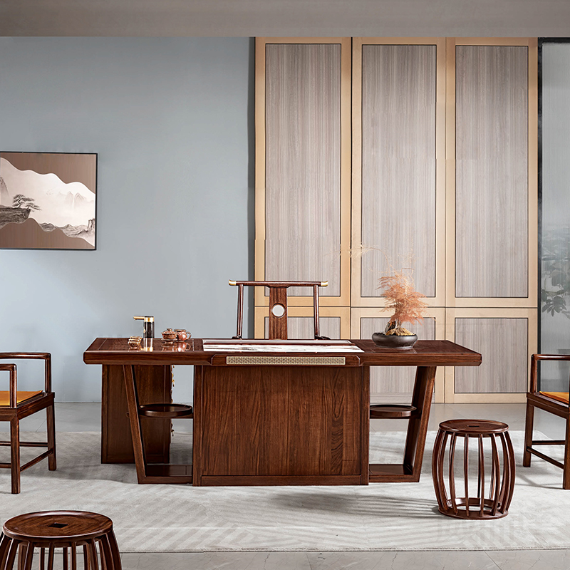 茶台轩雅 中式实木家具黑檀木茶台套组茶台主人椅茶椅圆凳 客厅